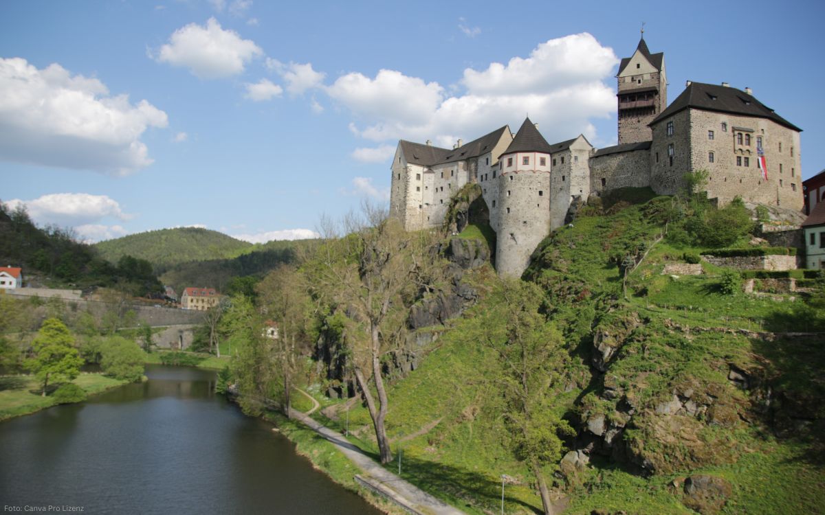 Die Burg Loket erhebt sich majestätisch auf einem Felsvorsprung über einer tief eingeschnittenen Flussschleife der Ohře (Eger) – ein Anblick, der seit Jahrhunderten Besucher begeistert. Der Name Loket bedeutet übersetzt „Ellenbogen“ und bezieht sich auf die markante Biegung des Flusses, die die Burg fast vollständig umschließt.